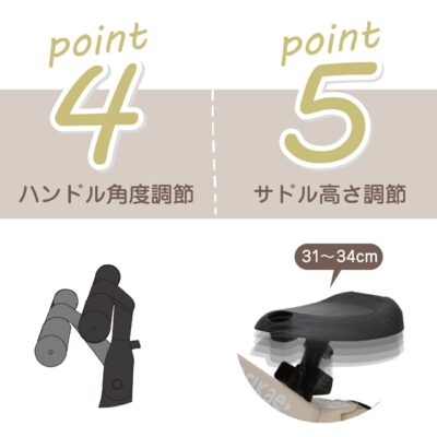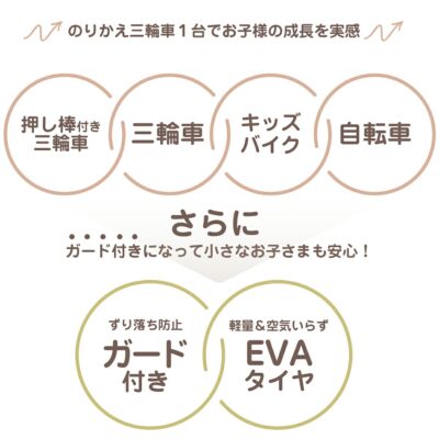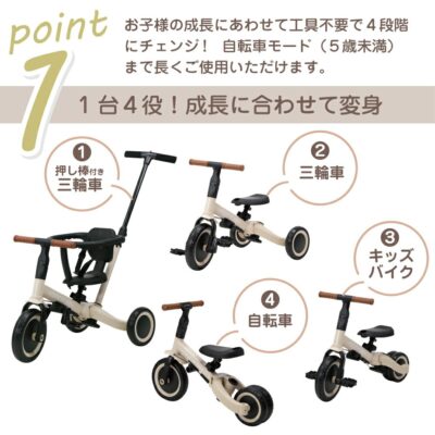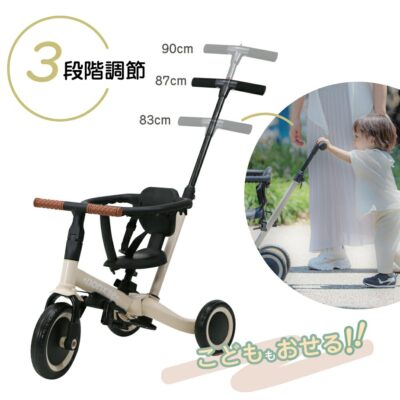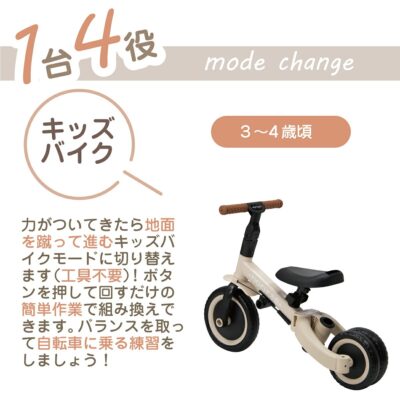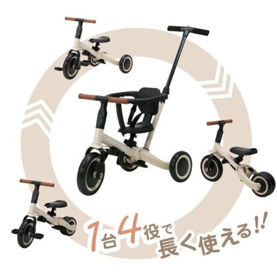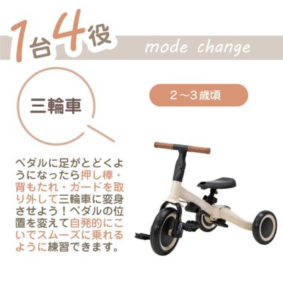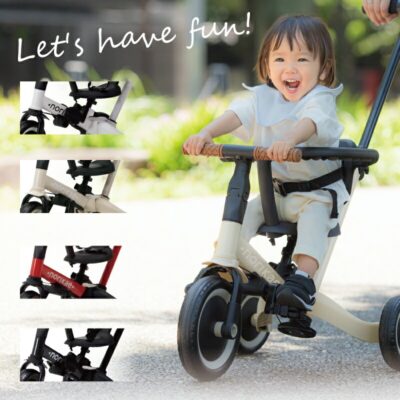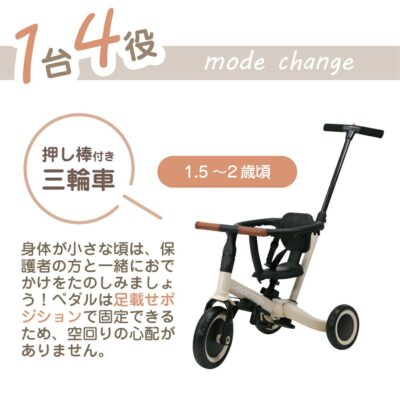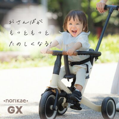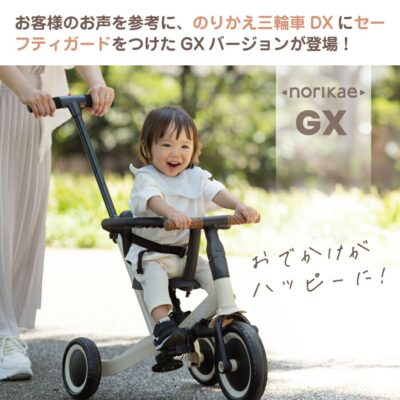 のりかえ三輪車「GX」は、1.5歳から5歳未満のお子さまの成長に合わせて4つのモードで使えるロングユース設計
